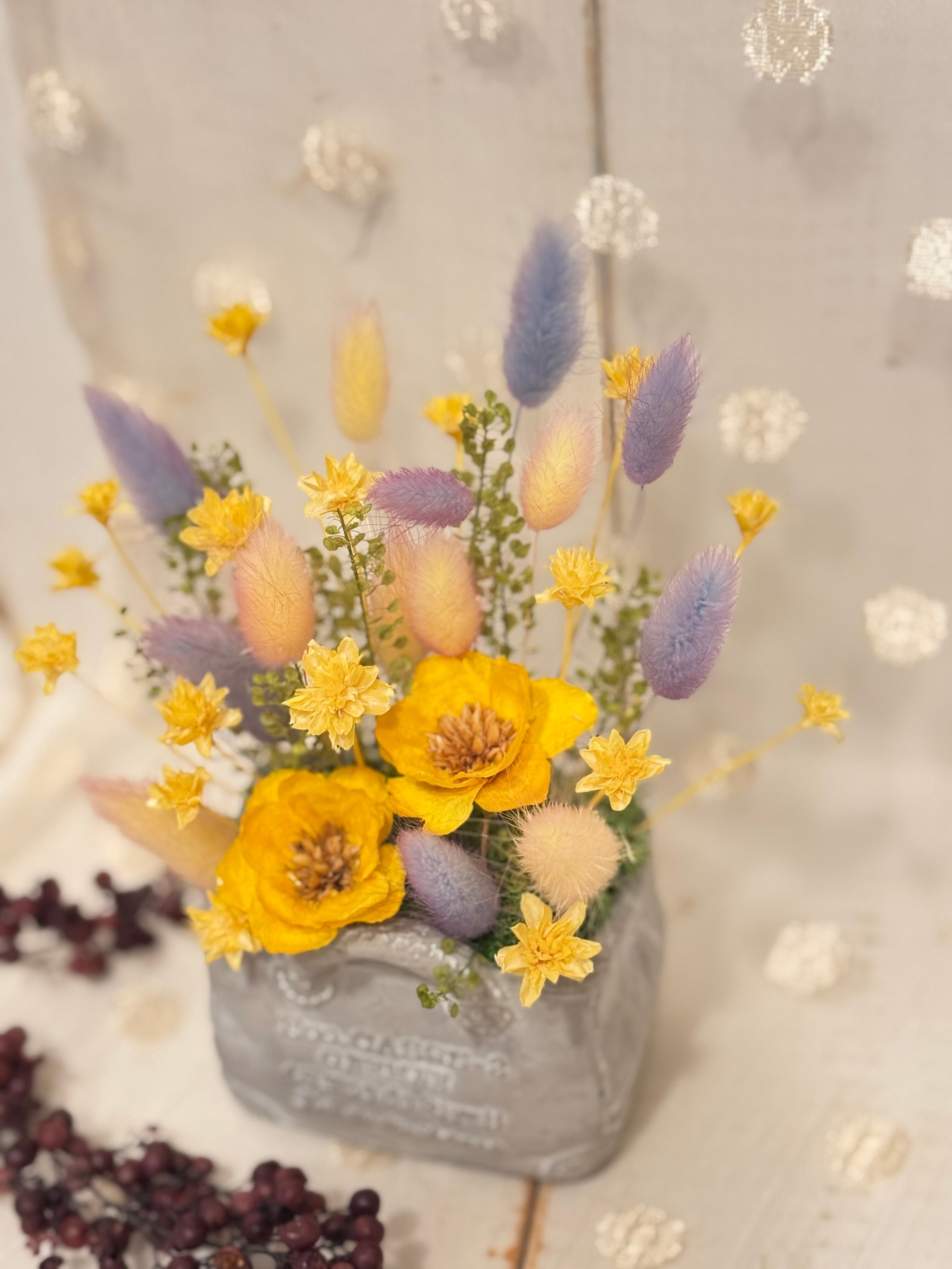 • 素材:ドライフラワー(ラグラス、イエロー系花材)、陶器ポット(モルタル製)